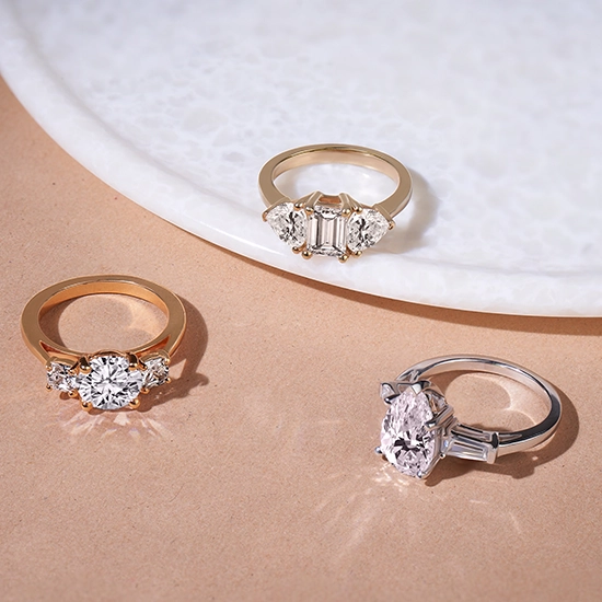 When creating your diamond engagement ring, you might want to shop for a diamond that is not necessarily large, which is absolutely fine when you have a set budget. But you can always make the diamond appear larger by selecting the perfect ring setting. For example, choose a halo ring setting or ring setting with two smaller side diamonds to accentuate your center diamond, making it appear larger.